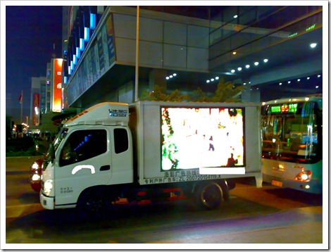 街头的广告车,车厢左右面均为大面积液晶屏,显示效果一般,确实挺吸引眼球,看车面说明,还申请了专利,不过成本应该不低,。
