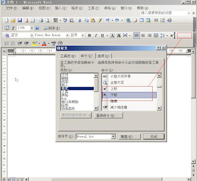在菜单栏选择"工具"–>"自定义"–>"命令"–>"格式",在右侧命令中找到上标、下标,选中后按住鼠标左键拖动到工具栏中,详见下图。今后使用时,选中作为上标(下标)的文字,再选择工具栏上相应的上标或下标按钮即可。